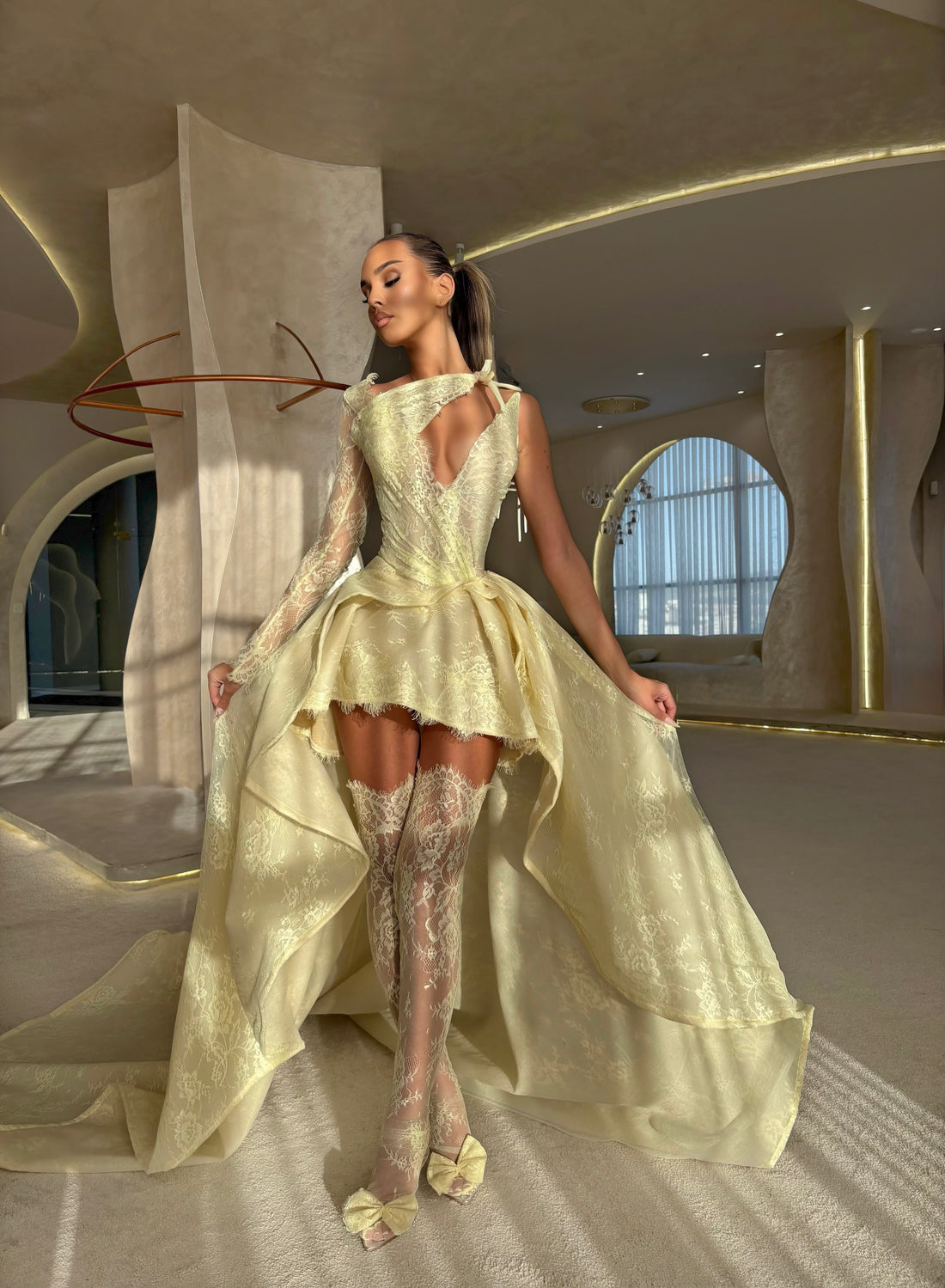 A shimmering champagne high-low gown, featuring a strapless corset bodice and a voluminous skirt adorned...