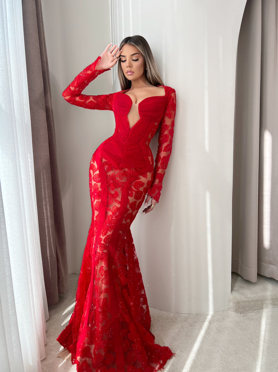 Long Red dress Strapless with vertical boning and matching gloves Sculpted bodice High slit Train...