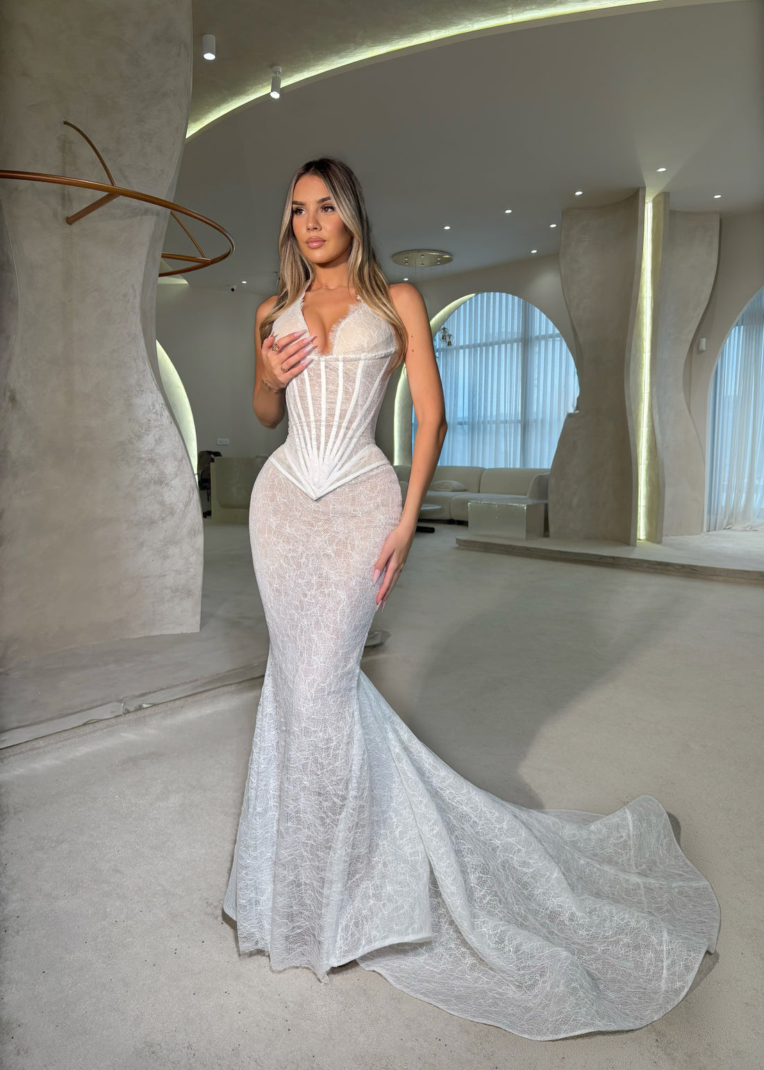 White bridal dress Mermaid silhouette Crop top and skirt set Model is wearing a size...