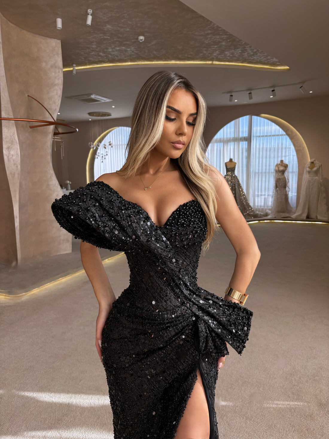 Long Dress Fully embellished with sparkling sequins Deep plunging neckline tied with a delicate black...