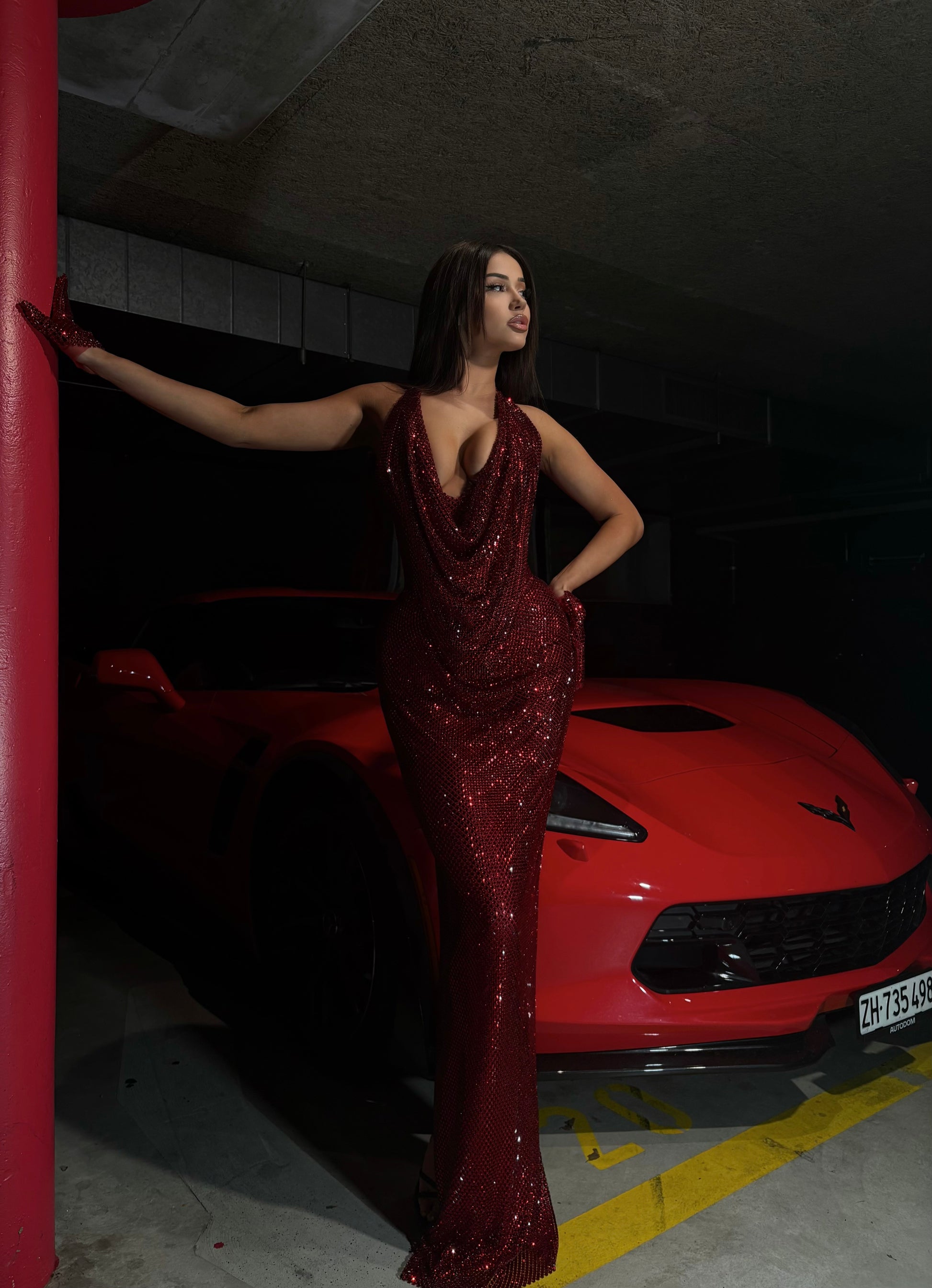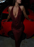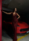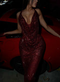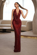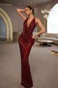 - Deep red sequin gown with a dramatic cowl neckline