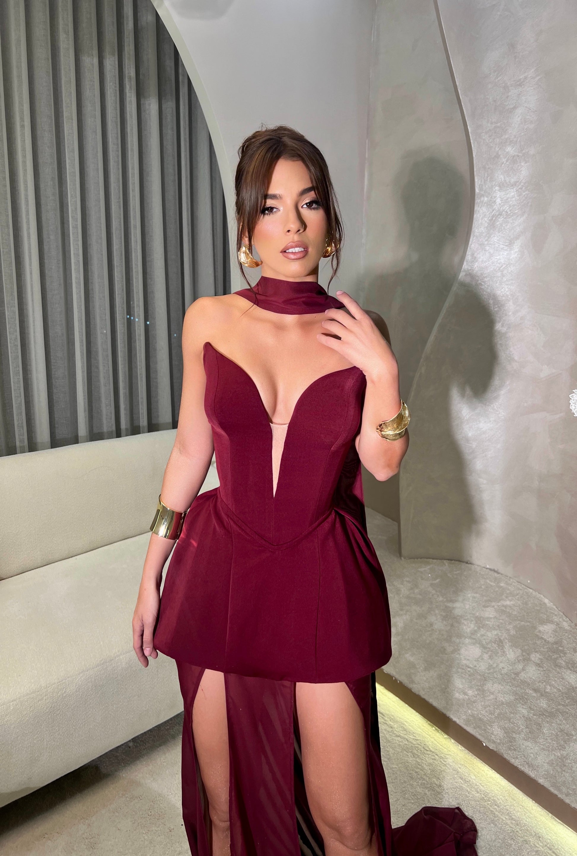 - Deep V-Cut with tulle fabric underneath
