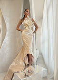 A soft blush nude dress, paired with matching nude heels