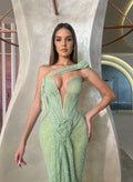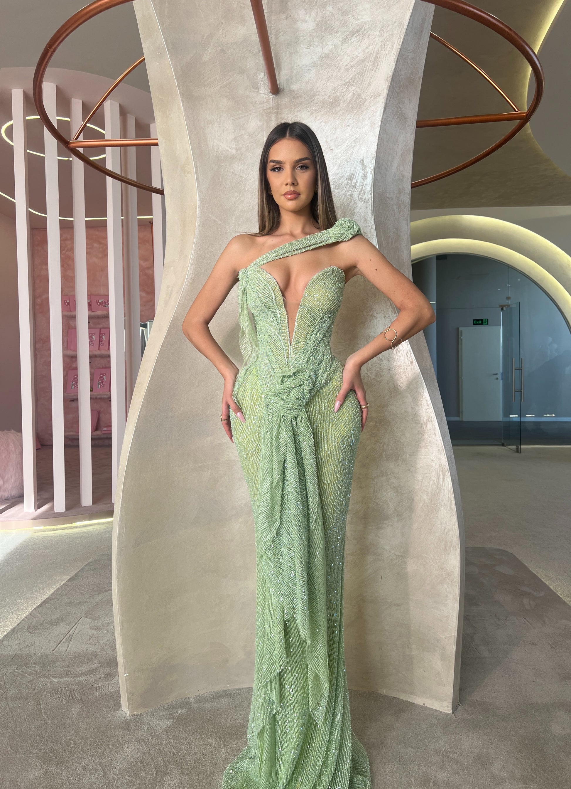 Long Dress Asymmetrical design with a flower embellishment on top and the waist area Sleeveless Sweetheart neckline Corset with laces Front pleated mid cape Straight fitted skirt Floor length Model is wearing a size S