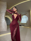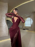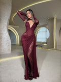 Defined by grace and desire — a masterpiece in burgundy lace and fluid draping.